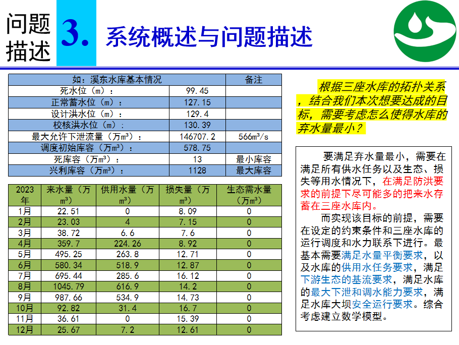 正是基于這樣的現實(shí)痛點(diǎn),國水水務(wù)啟動(dòng)汀溪水庫群優(yōu)化調度課題研究,試圖以技術(shù)創(chuàng )新打破傳統調度的瓶頸。交流會(huì )上,國水水務(wù)技術(shù)團隊詳細介紹了課題的核心研究思路:首先通過(guò)梳理汀溪水庫群中汀溪水庫、溪東水庫、竹壩水庫的拓撲關(guān)系與水文數據,明確各水庫的功能定位與約束條件;隨后結合歷史水文數據與區域用水特征,構建涵蓋“水文預報誤差、需水波動(dòng)、發(fā)電負荷變化”的多約束模型,并引入遺傳算法進(jìn)行求解,最終實(shí)現“在保障防洪安全的前提下,******化減少棄水、提升供水保障率與生態(tài)流量滿(mǎn)足度”的目標。
